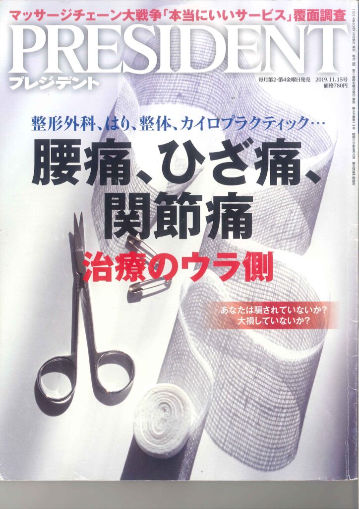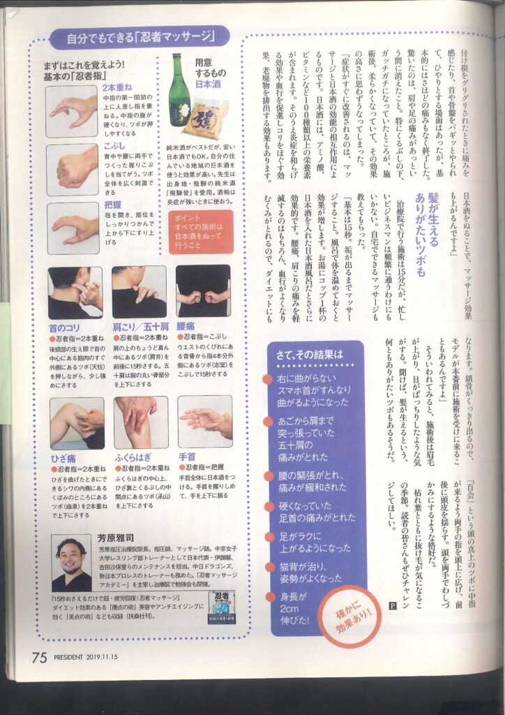 「プレジデント」では、首こり・肩こり・四十肩・五十肩・腰痛・膝痛・ふくらはぎ・手首の痛みへの自宅でできる忍者マッサージをご紹介させていただきました。