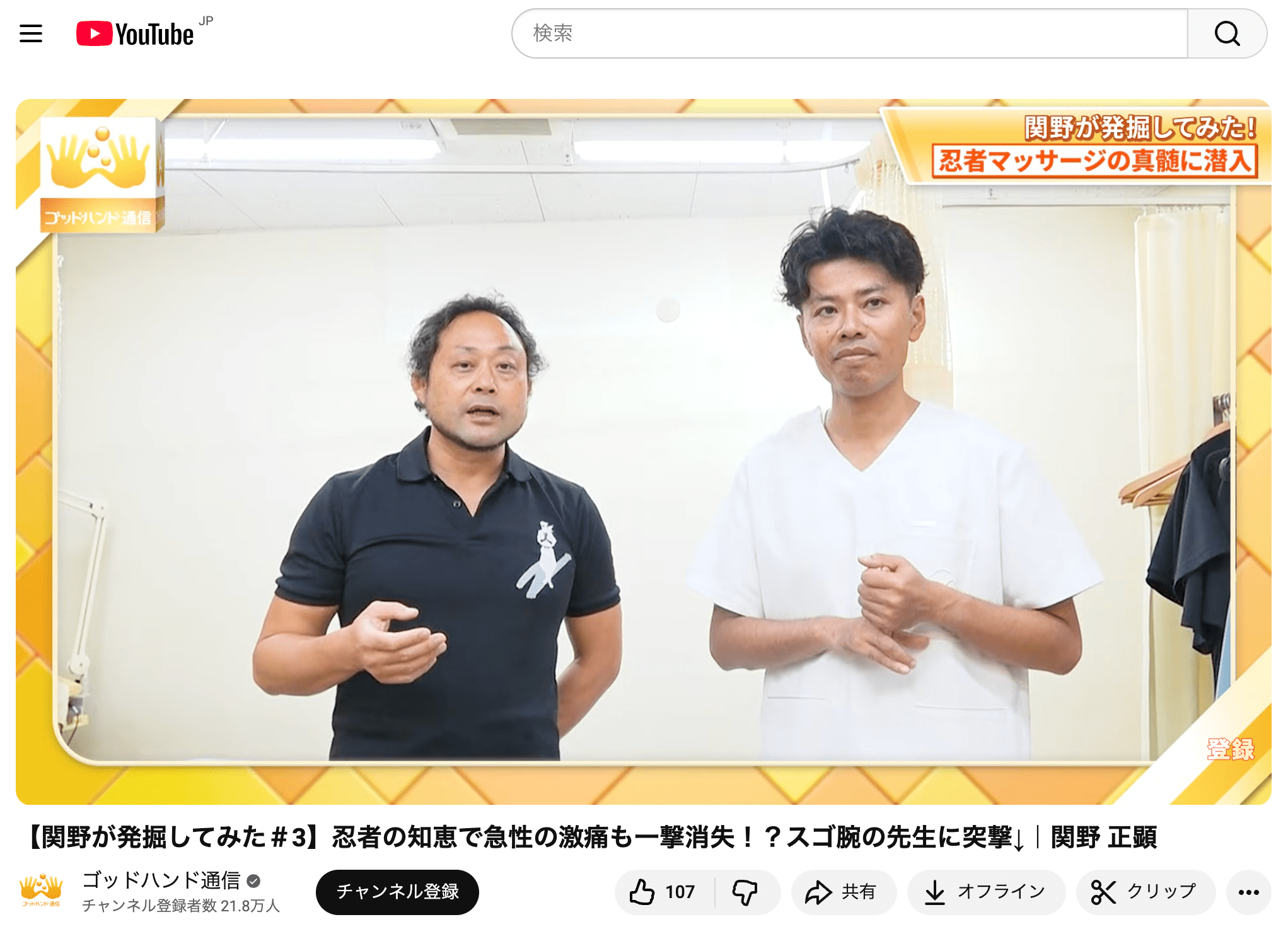 前述の忍者マッサージのルーツに加え、なぜ日本酒や酒粕で痛みが取れるのか、マッサージで使う手や指の使い方なども動画内で紹介しています。